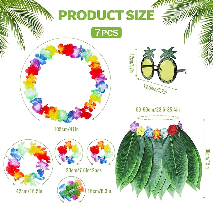 - ๐๐๐๐ฐ๐๐ข๐ข๐๐ง ๐๐จ๐ฌ๐ญ๐ฎ๐ฆ๐ ๐๐จ๐ซ ๐๐ข๐๐ฌ There are 7Pcs in total,including leaf hula skirt x1,lei necklace x1, lei headband x1, wrist lei x2, flower barrette x1,pineapple glasses x1.This is a perfect grass skirt set for dressing up in summer Hawaiian party.