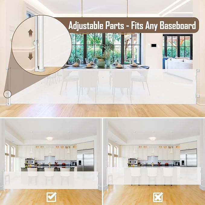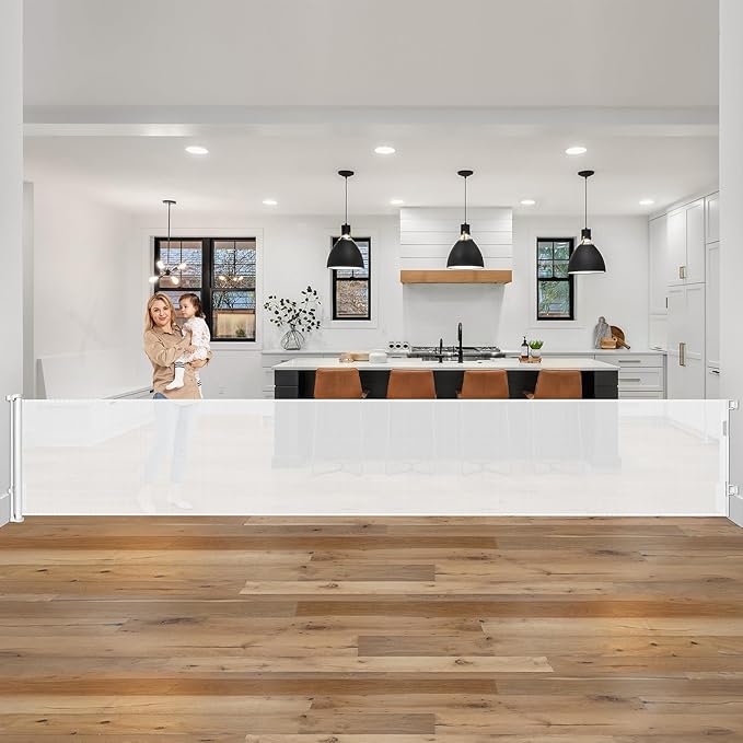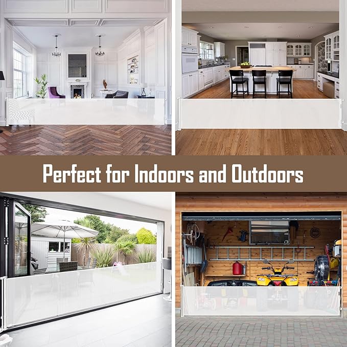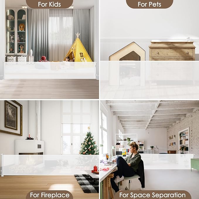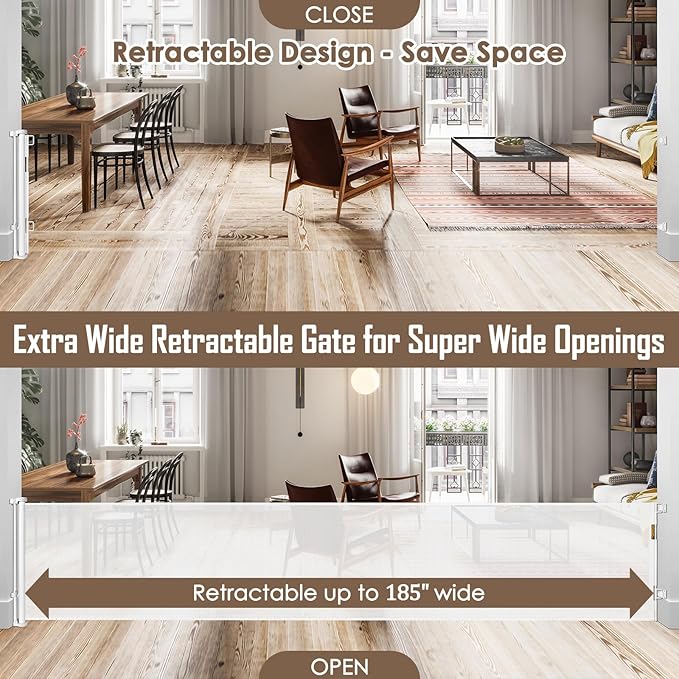 - 185-inch Extra-Wide Coverage: This retractable baby gate extends up to 185 inches, making it perfect for securing large indoor and outdoor openings. Whether it's doorways, hallways, garages, decks, or more, this retractable fence works effectively as both a barrier and room divider.