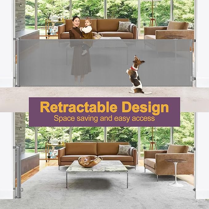 - 160 Inch Extra Wide & Retractable Design: Our extra tall pet gate fits 0-160" wide openings. You can adjust the width to fit your wide opening according to your needs. When not in use, the mesh can be completely retracted away to save you space.