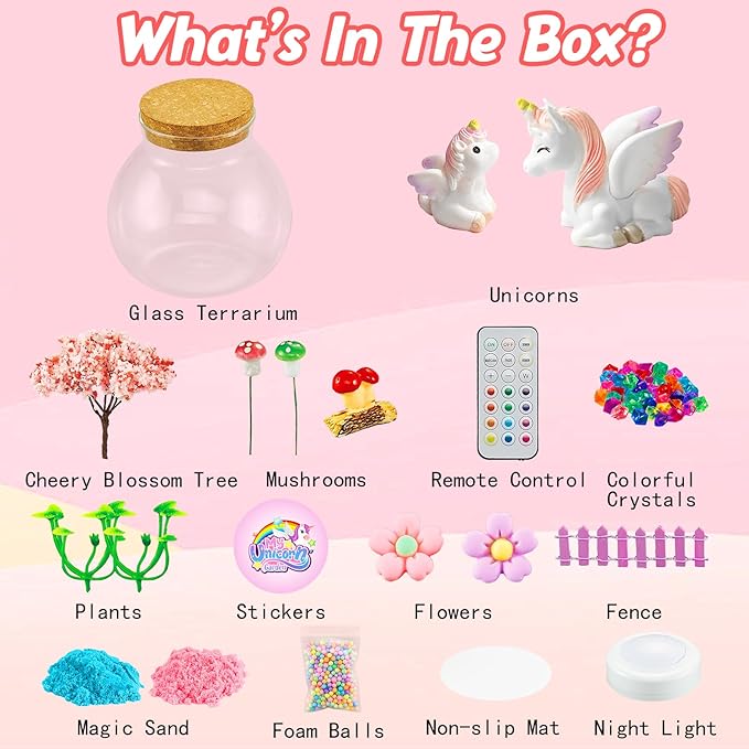 - MAKE YOUR OWN UNICORN NIGHT LIGHT: This unicorn terrarium kit includes Terrarium, night light, remote control, soft stopper cover, non-slip mat, cherry blossom tree, mushrooms, unicorns, flowers, plants, mushroom stump, colorful crystals, foam balls, pink magic sand, blue magic sand, fence. It allows kids to design and build their own magical unicorn night light, sparking creativity and imagination.