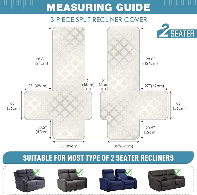 - 【2 SEATER RECLINING FIT】Our 2 seater recliner loveseat cover is designed to fit 2 seater love seat sofas, made with 2 seperate pieces , perfectly fit 51.2 inch reclining 2 seater sofas. For more details, please refer to the measurement guide in the photo, please measure before purchase