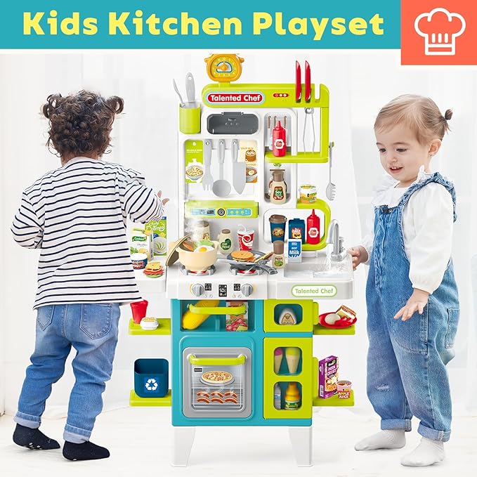 - Interactive Play Kitchen for Kids: This 40-inch kitchen play set comes with various toy kitchen accessories including pots and pans,pretend sink, kitchen utensils, and more, rich accessories allow children to role-play as real chefs, making their playtime more engaging and fun
