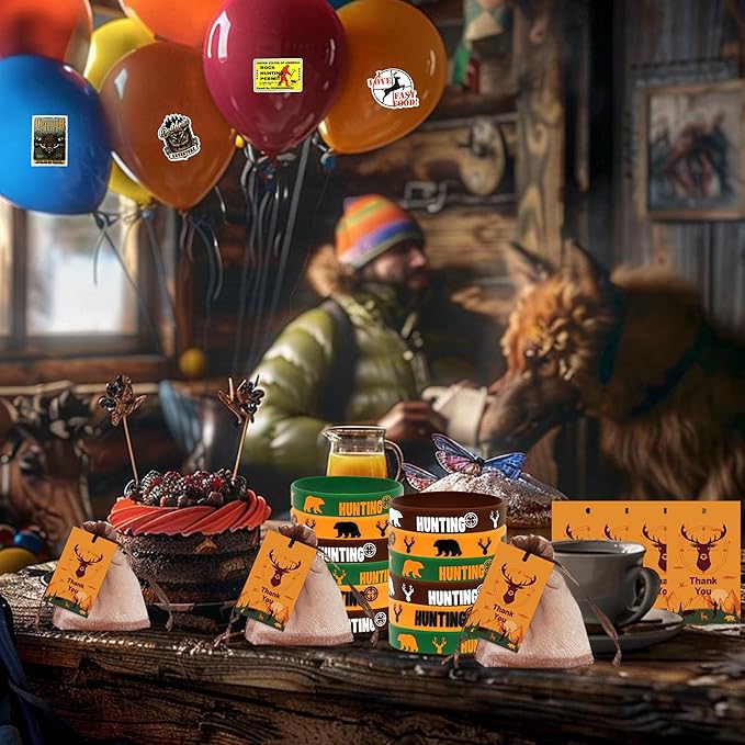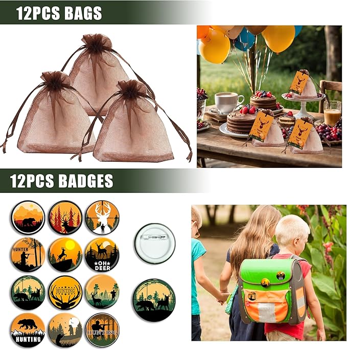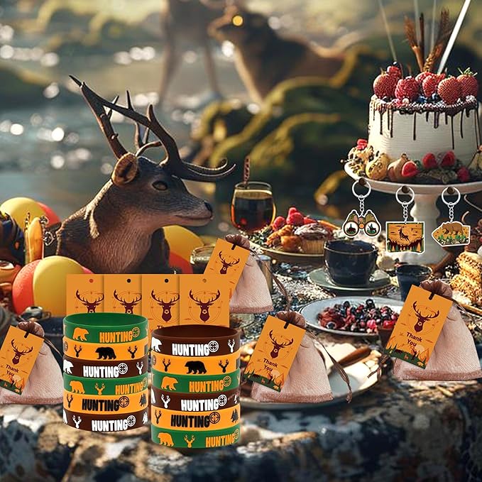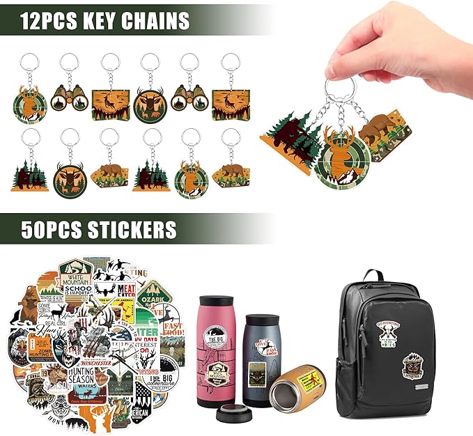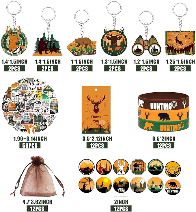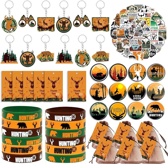 Tazimi 110 PCS Hunting Party Favors Hunting Birthday Party Supplies Camo Party Favors with Hunting Keychains Stickers Rubber Bracelets Button Pins and Bags for Hunting Theme Party