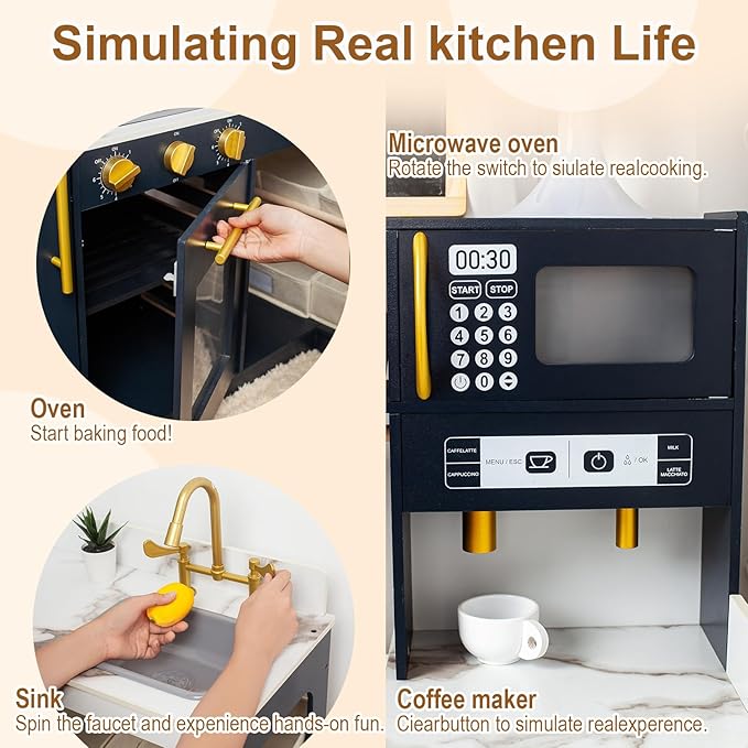 - Plenty of Play Features: This kids kitchen playset includes a range of captivating features, such as a stove and range hood with lights and sounds, a refrigerator, an ice maker, a microwave, an oven, a coffee maker, a sink, and categorized storage baskets. It also comes with 14 pcs colorful accessories to inspire endless imagination. The knobs make a "click-clack" sound, providing tactile and auditory feedback, while the ice maker pretends to dispense ice cubes.