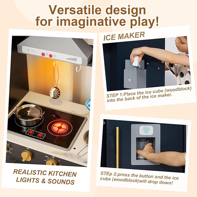 • Plenty of Play Features: This kids kitchen playset includes a range of captivating features, such as a stove and range hood with lights and sounds, a refrigerator, an ice maker, a microwave, an oven, a coffee maker, a sink, and categorized storage baskets. It also comes with 14 pcs colorful accessories to inspire endless imagination. The knobs make a "click-clack" sound, providing tactile and auditory feedback, while the ice maker pretends to dispense ice cubes.