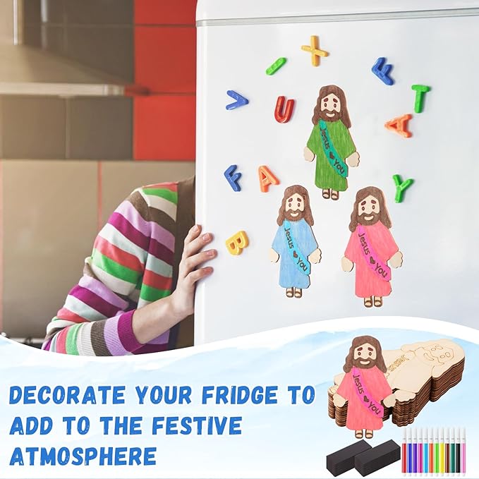 - Extensive DIY Experience: includes 24 pcs of wood Jesus figure crafts, 24 pcs of magnets with adhesive back, and 12 pcs of mini color pens; These provide you and your family with a creative and fun experience, fostering a holiday ambiance; A good choice for vacation Bible school crafts