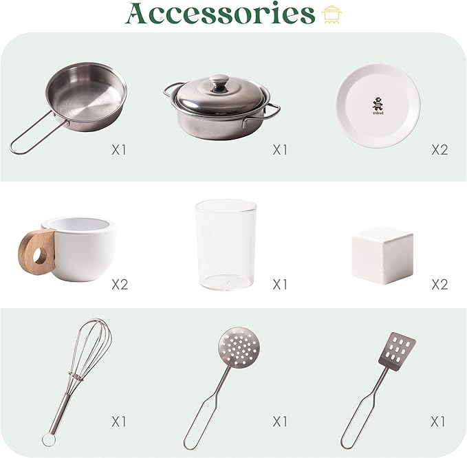 - AN EXQUISITE PLAY SPACE: This green corner kitchen playset for kids features elegant gold handles and accessories, combining a natural and refined look. With smooth edges and lightweight, durable cookware, it ensures safe playtime for children. All products and accessories are crafted with smooth, burr-free surfaces, allowing children to play joyfully and safely. The kitchen also has hollow handles on both sides, making it easy to move and enjoy in any room of the house.