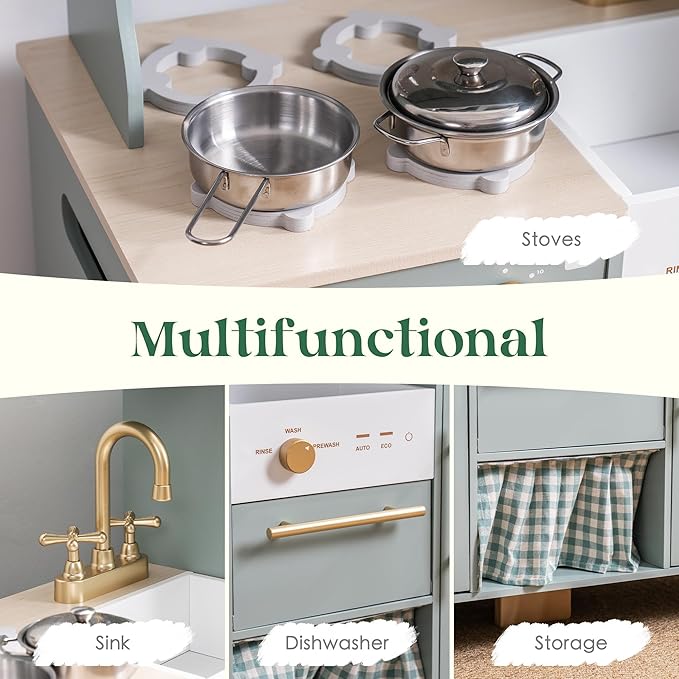 - AN EXQUISITE PLAY SPACE: This green corner kitchen playset for kids features elegant gold handles and accessories, combining a natural and refined look. With smooth edges and lightweight, durable cookware, it ensures safe playtime for children. All products and accessories are crafted with smooth, burr-free surfaces, allowing children to play joyfully and safely. The kitchen also has hollow handles on both sides, making it easy to move and enjoy in any room of the house.