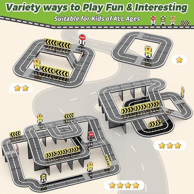 - 【Compatibility and Complementarity】Our magnetic road tiles are designed to be highly compatible with existing magnetic tiles on the market.These magnetic toys enable kids to directly build a comprehensive racing track, while also providing a way to complement their existing magnetic tile structure such as the city street scene. The versatile magnetic road tiles can be rearranged in different configurations to build intricate racing circuits.Blending them with toy cars further enhances the immersive, more diverse gameplay, and an overall enriched play experience for kids 3+ years old.