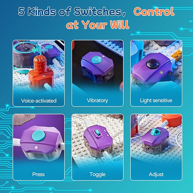 - STEM Educational Building Toys - Play while learning toys, in addition to knowledge of electricity, the science circuit board building STEM kits will stimulate curiosity, and develop kids' logical thinking, hands-on skills, problem-solving skills, imagination and creativity. The circuit boards for kids are designed in building blocks, kids can combine with other blocks or code programming toys to build their electric cities or playgrounds or more, it's all up to their imagination and creativity!