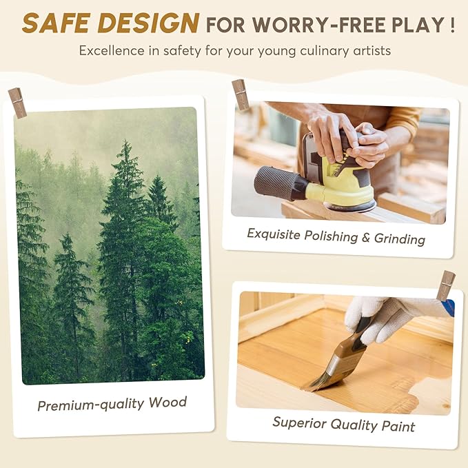 - Wooden Play Kitchen: BIERUM Play kitchen is crafted from ASTM and CPSIA certified wood materials, free of BPA, and coated with non-toxic paint. It's sturdy, durable, and absolutely safe for children. This space-friendly play kitchen measures 21.8 inches wide and 11.6 inches deep once assembled.