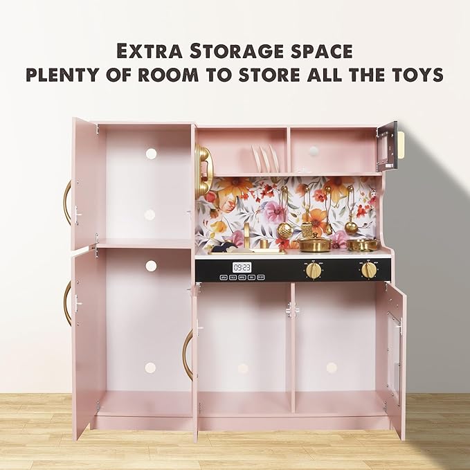 - š Simulated Design - Play Kitchen with Lights. Oven, cabinet, freezer, refrigerator and microwave doors open and close. Equipped with a variety of realistic cooking utensils,make pretend play more lively and interesting. Create an immersive play experience for children and kids