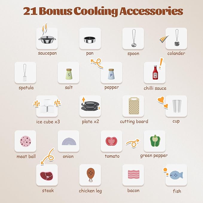 • 21 ACCESSORIES INCLUDED:This set is purposefully designed to emulate a real kitchen environment, featuring a variety of mock ingredients, pots, utensils, a cutting board, and condiments. Each element is tailored from safe materials for the security of your children. With this comprehensive and engaging gift ready at their disposal, children are primed to embark on their enchanting imaginary cooking journey directly