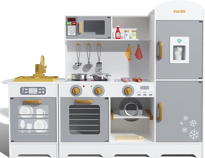 - MORE INTERACTIVE FUNCTION: This innovative play kitchen set comes with numerous ultra-realistic features including a pressable ice-maker that dispenses pretend ice cubes, a stove with corresponding sound and light effects, a faux microwave that mimics the real heating process with authentic sounds and lights, and a real faucet that dispenses water. These genuine details, mirroring a real-life kitchen, amplify the children's experience by providing an engaging and immersive play environment