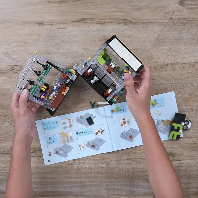 - 【Beautifully modeled home décor】:This City House Building Block toy is a chic kids coffee shop Model, this building bricks set has a cute panda shape signboard, surrounded by green plants and flowers, great for office or home decor.