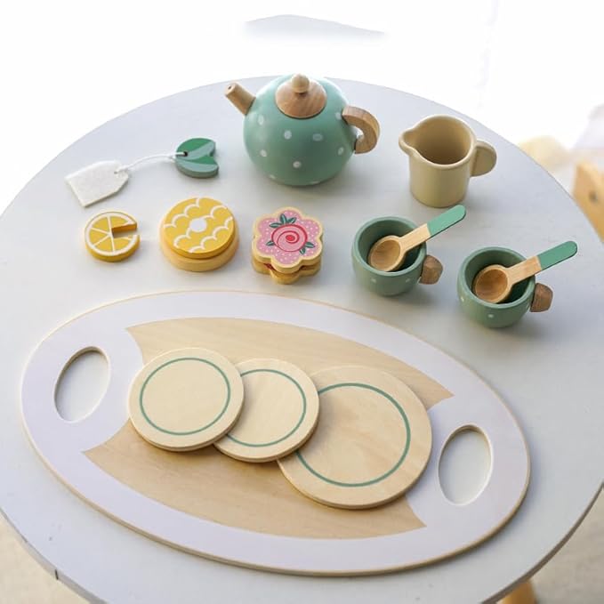 - COLORFUL WOODEN KIDS PRETEND TEA SET:Wooden tea party set includes 1 teapot, 2 tea cups, 3 plates (2 small and 1 big), 2 spoons, 5 different food toys (tea bag, chocolate cookie, lemon tart, lemon slice and sandwich cookie), 1 milk jug, and 1 wooden tray for holding whole tea set.