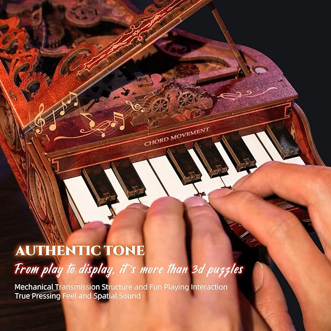 - 【Intricate Gear Mechanics】Inside this 3D wooden puzzle piano, a multi-stage gear system comes to life as you play, visible through a transparent cover.