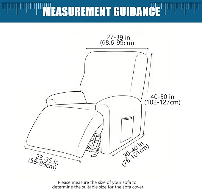 - 【PERFECT FIT】 Two-way stretch fabric will follow every corner of the recliner chair, including the arms. Highly fits with seam details. The strapless and bottom elasticized design make the cover stay in place well without moving.Side pocket design, you can put your remote control, glasses or any small items on slide pocket for easy access.To make sure getting the perfect fitting, please measure your furniture before ordering. Fit recliner width between 24-33 inches.