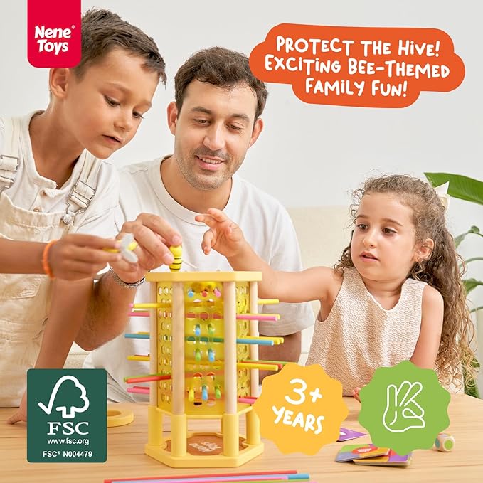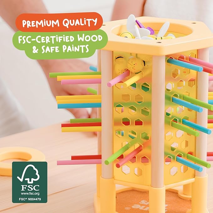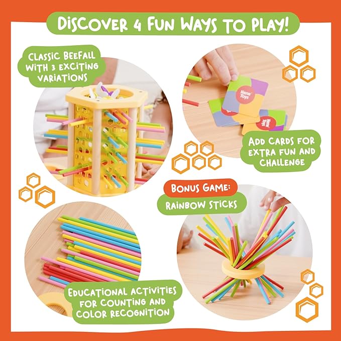 - 🟢 SAFE, DURABLE MATERIALS FOR PEACE OF MIND: Crafted from high-quality, non-toxic wood, BeeFall is built to last. The sturdy wooden hive, vibrant sticks, and charming bees are designed to withstand enthusiastic play while keeping children safe.