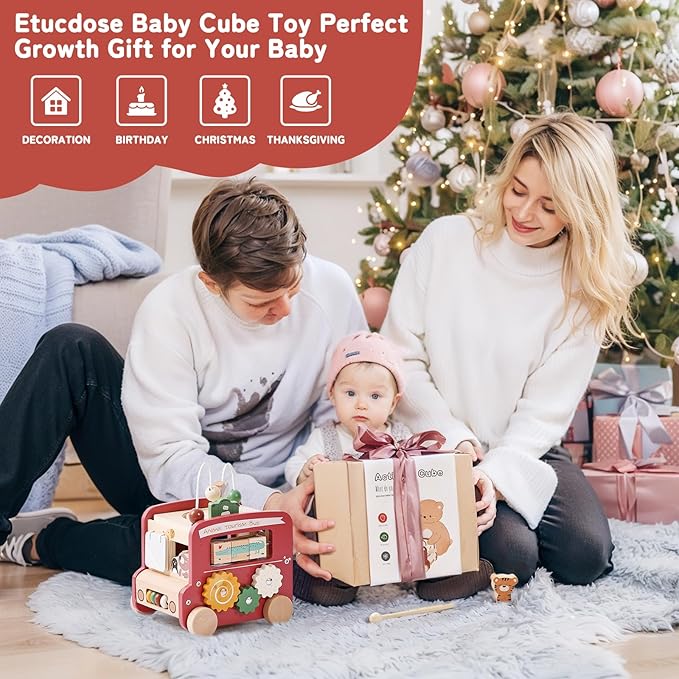 Wooden Activity Cube 8-in-1 Montessori Toys | Multifunctional Early Educational Learning Toys | Activity Cube for Baby Shape Sorter Xylophone Animal Travel Bus Toys Boy Girl Birthday Gift(Red Bus)
