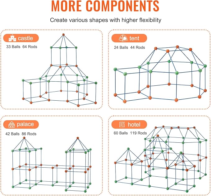 - 180-Piece Fort Building Kit: Explore endless possibilities with our kids fort building kit! It includes 60 solid balls and 120 lightweight yet durable connecting rods. Perfect for kids aged 4 and up to create their own 3D spaces—build forts, tents, pyramids, rockets, and more with parental guidance.