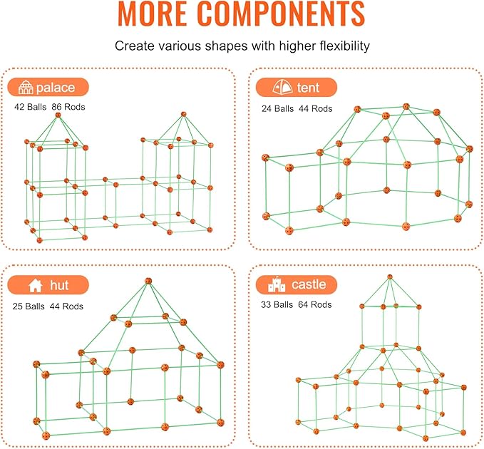 - 140-Piece Fort Building Kit: Explore endless possibilities with our kids fort building kit! It includes 44 solid balls and 96 lightweight yet durable connecting rods. Perfect for kids aged 4 and up to create their own 3D spaces—build forts, tents, pyramids, rockets, and more with parental guidance.