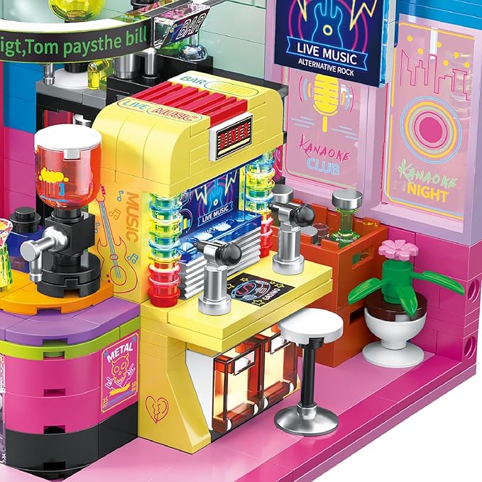 - đ°ăBuild Creative Bear Party Club Scenesă: 602 pcs building bricks Mini size - 2/3 of the regular size. More challenging than regular sizes. Easter basket toy building block. Build a visually appealing coffee shop house with the toy building set. In vibrant blue and pink colors, creating a lively atmosphere. Not a finishd product. Needs to be assembled. More details for you to discover.