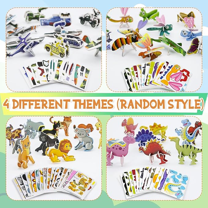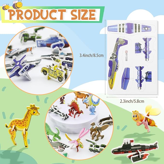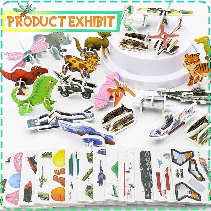 - Easy Assembly: 3D puzzles are straightforward to make. Simply remove the pieces from the template and fit them snugly into the slots. The 3D puzzle set is a mixed pack featuring puzzles with four themes: animals, insects, military, and dinosaurs.Each puzzle varies in complexity, offering challenges suitable for different skill levels