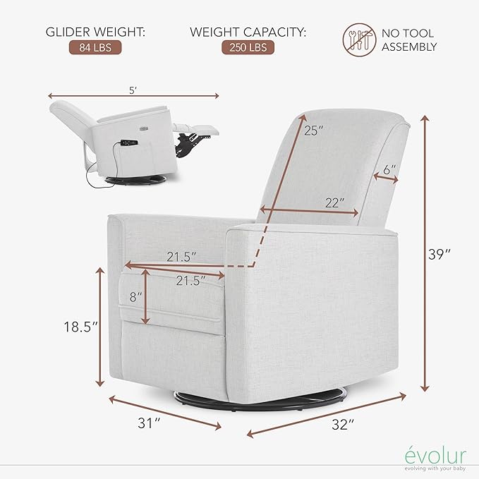 - STRONG & SAFE: The Evolur Harlow Glider With Massager is the 2022 JPMA Innovation Award winner. It is Greenguard Gold Certified, has a solid metal base, meets all CA TB117-2013 flammability requirements and has a 1-year Limited Manufacturer’s Warranty.