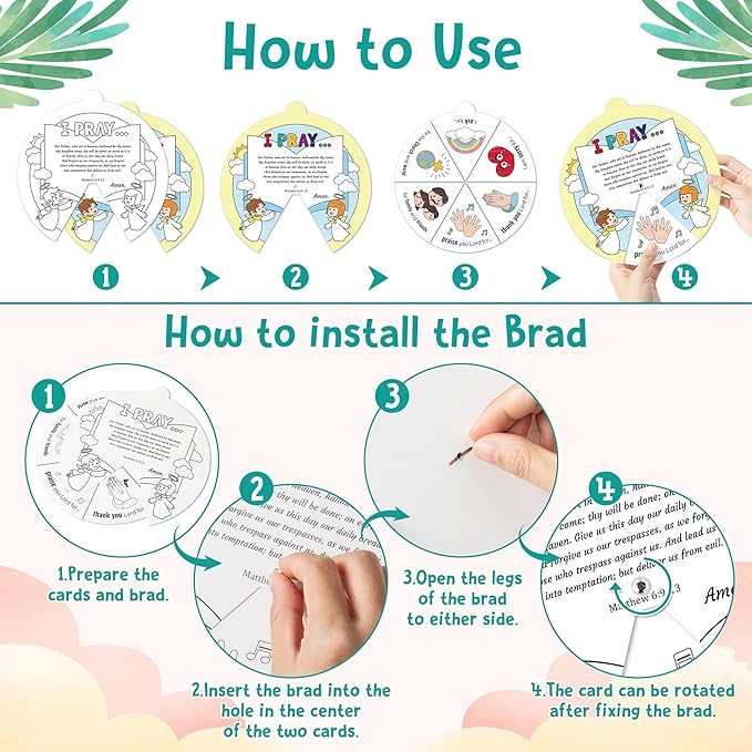 - Value Set: It comes with 48pcs The Lord’s Prayer theme coloring cards, 4 different kinds patterns and each kind has 12pcs as well as having 24 brads for assembling the card to reach the rotating card. The cards measure about 8.7 inch x 8.7 inch.