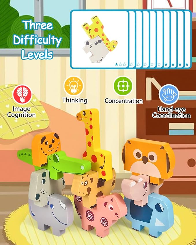 - 【Montessori Toys for Kids】This wooden sorting & stacking toy contains 10 different shaped blocks, These are blocks with simple lines on the blocks to outline different animals: giraffe, sheep, puppy, cow, crocodile, hippo, elephant, mouse and rhino. 10 piece double-sided challenge cards with three different levels of real challenge.When babies try to match the blocks to the target or make various combinations, they can also get so much pleasure.