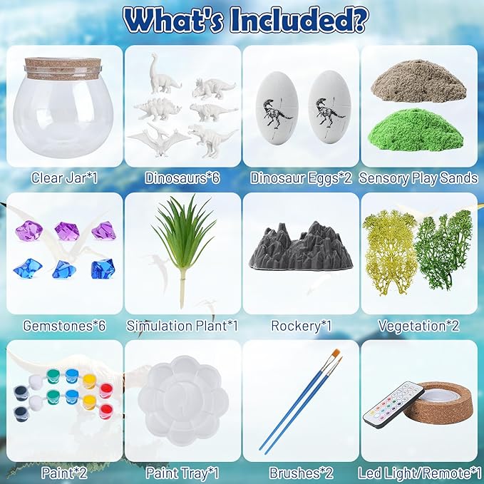 - 【Craft Kits Details】This dinosaur toy set contains magic sand*2, moss*2, remote control*1, 6 different dinosaurs (Tyrannosaurus Rex, Pterodactyl, Stegosaurus, Athletosaurus, Cyclops, Brontosaurus), dinosaur eggs*2, small tree*1, crystal stones*6, coloured lights*1, clear jar*1, wigwam*1, paint bucket*2, paint brushes*2, oil painting tray*1.