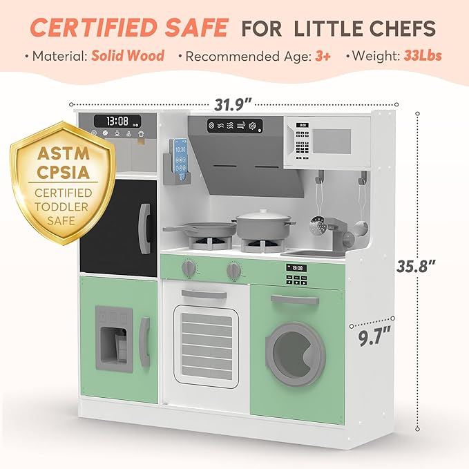 - Premium Wooden Play Kitchen: BIERUM Play Kitchen is crafted from ASTM & CPSIA certified wood materials, ensuring it’s BPA-free, non-toxic, and coated with child-safe paint. Durable and safe for kids, this space-friendly kitchen measures 32 inches wide and 9.7 inches deep when assembled.