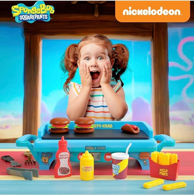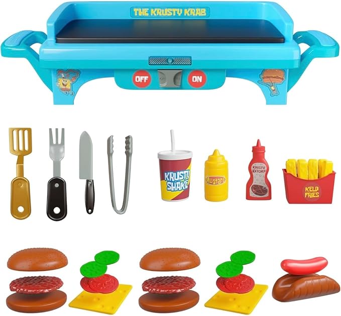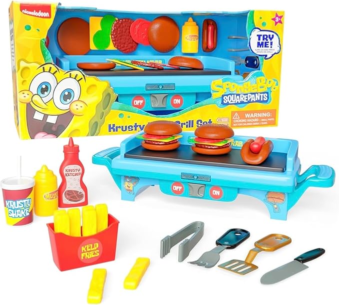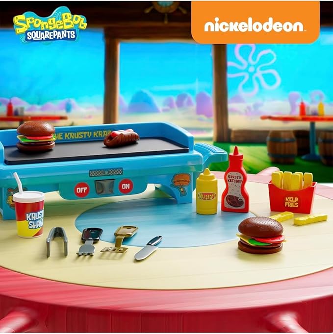 - SpongeBob SquarePants Grill: Enjoy SpongeBob culinary adventures as they come alive with this BBQ grill plastic utensils pretend burgers and condiments Kelp Fries and Krusty Shake