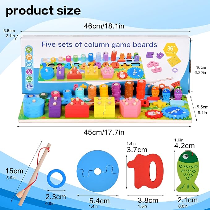 - The multi-functional fishing class is made of natural wood and covered with non-toxic water-based paint. The smooth surface of the board has been carefully polished, and the large-sized figures are made for the safety of small researchers, are guaranteed safe toys and perfect puzzle toys for play and learning. Color pictures and the classification of inserted different colors and numbers help to distinguish colors, geometric shapes, and develop fine motor skills.