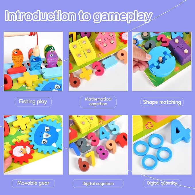 - This shape number fishing game board, which has interesting animals and animal images, colorful cars, small fruits, develops young children's color, shape, number recognition, hand-eye coordination, encourages creativity and imagination, fine motor skills, math counting skills, and is an ideal toy for young children's preschool learning.
