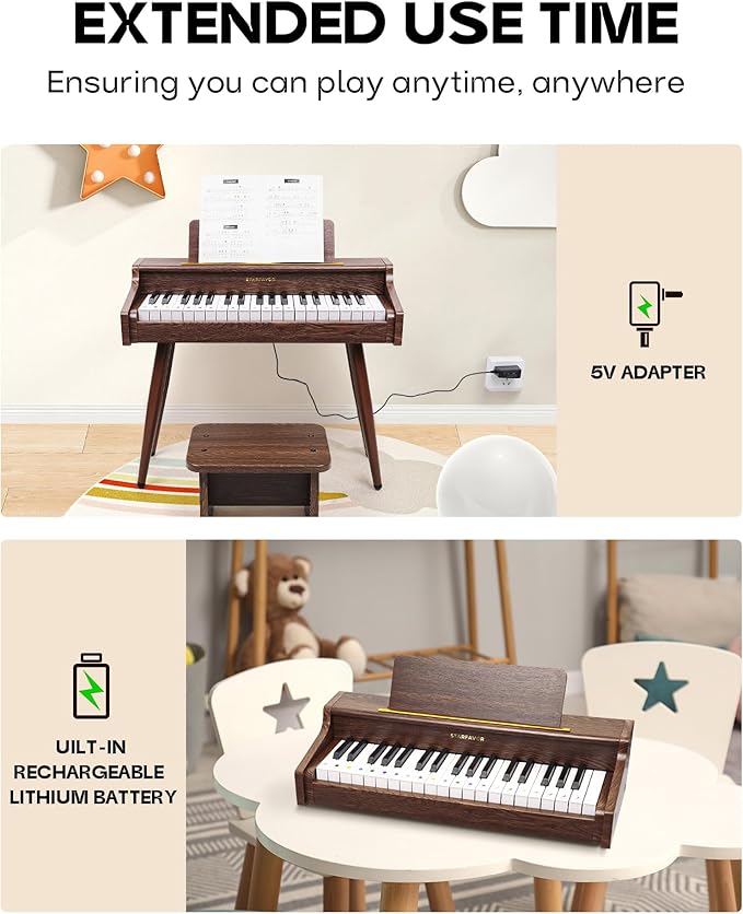 Starfavor Kids Keyboard, 37 Keys Digital Piano with Volume Control, Rechargeable Music Educational Instrument Toy, Wood Piano for 3+ Girls, Boys, Beginner, Toddler