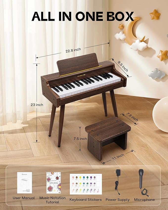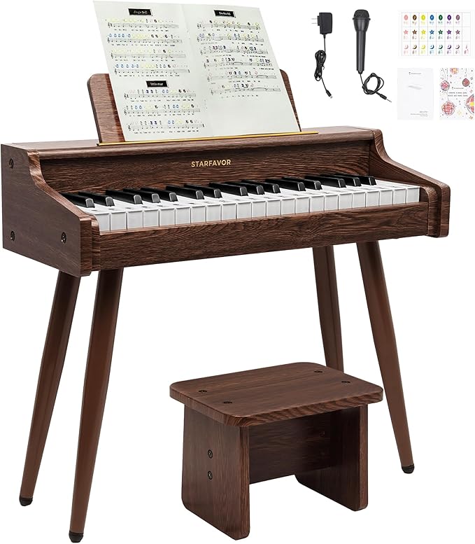 - Complete Starter Kit – Perfect Gift: The Starfavor SEK-37W Wooden Keyboard Piano comes with a comprehensive kit that includes a bench, getting-started tutorial, microphone, key stickers, user manual, and power adapter. An ideal gift for children aged 3 and above, this package sets the stage for a rich musical journey.