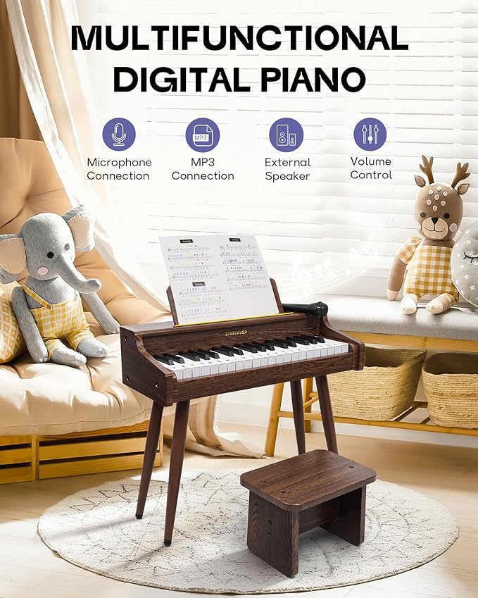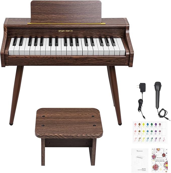 - Complete Starter Kit – Perfect Gift: The Starfavor SEK-37W Wooden Keyboard Piano comes with a comprehensive kit that includes a bench, getting-started tutorial, microphone, key stickers, user manual, and power adapter. An ideal gift for children aged 3 and above, this package sets the stage for a rich musical journey.