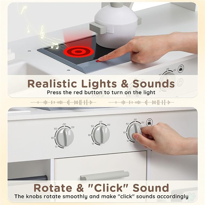 • High-Quality Construction: Crafted from premium, durable wood, this play kitchen set is built to withstand hours of imaginative play, ensuring long-lasting fun for your little chef.