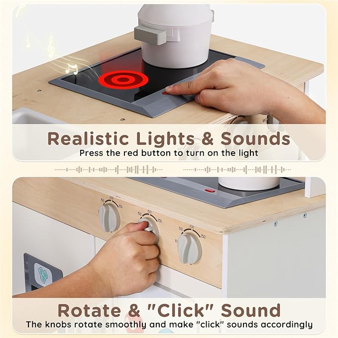 • High-Quality Construction: Crafted from premium, durable wood, this play kitchen set is built to withstand hours of imaginative play, ensuring long-lasting fun for your little chef.