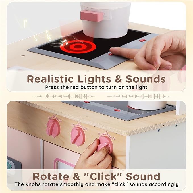 • High-Quality Construction: Crafted from premium, durable wood, this play kitchen set is built to withstand hours of imaginative play, ensuring long-lasting fun for your little chef