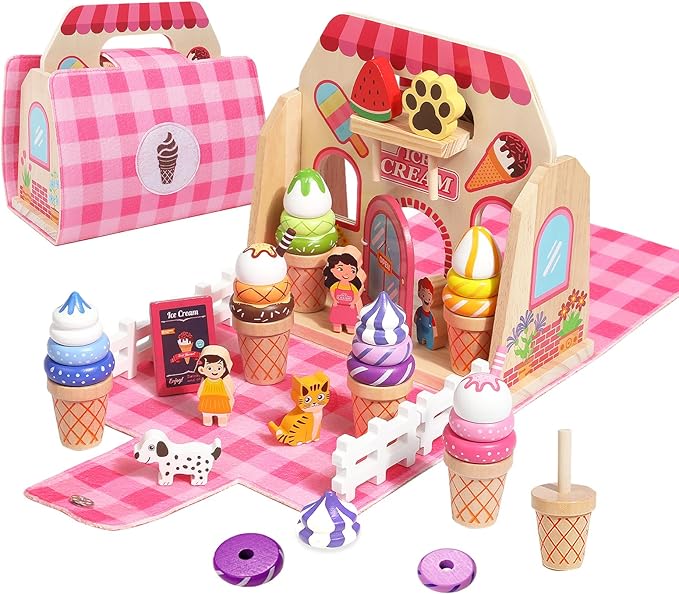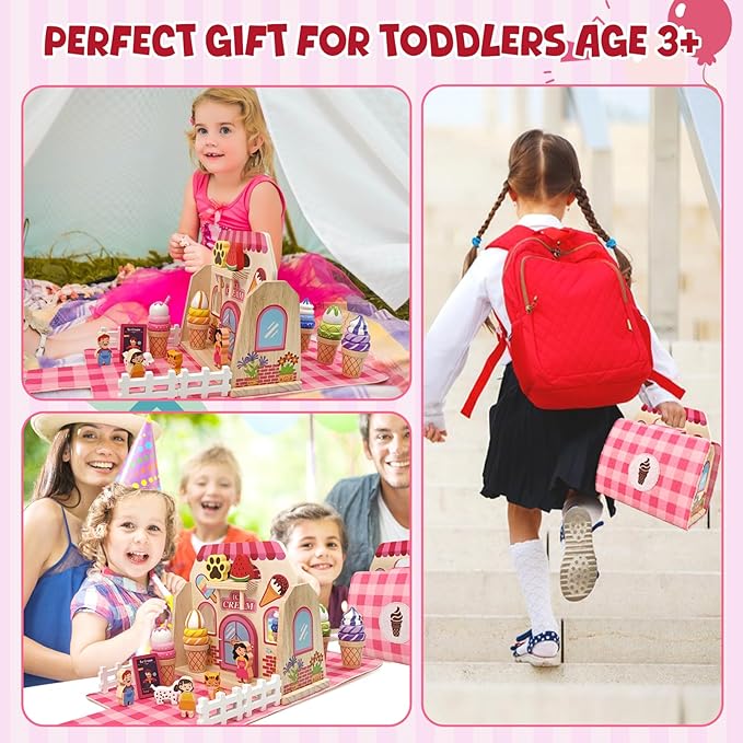 - 【2 in 1 Ice Cream Play Set】Wooden ice cream shop set is designed to be both entertaining and practical. When open, it transforms into a open-style ice cream shop, complete with all the accessories kids need to create their own pretend ice cream parlors. After the end, all accessories are stored together and folded into a carrying handbag. This feature makes it easy for kids to organize their toys and helps keep their rooms tidy.