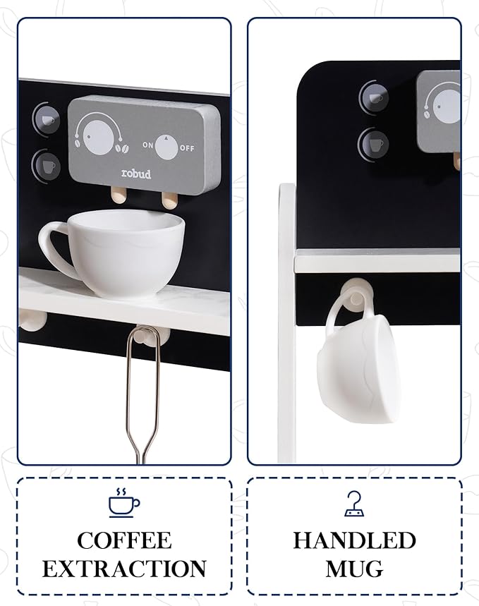 • 【Realistic Features】 This kitchen playset includes a faucet with a sink, a stovetop, and a functioning oven door, allowing children to simulate real cooking activities. It also features a coffee-making station, where kids can pretend to brew coffee, adding extra fun and detail to their playtime.