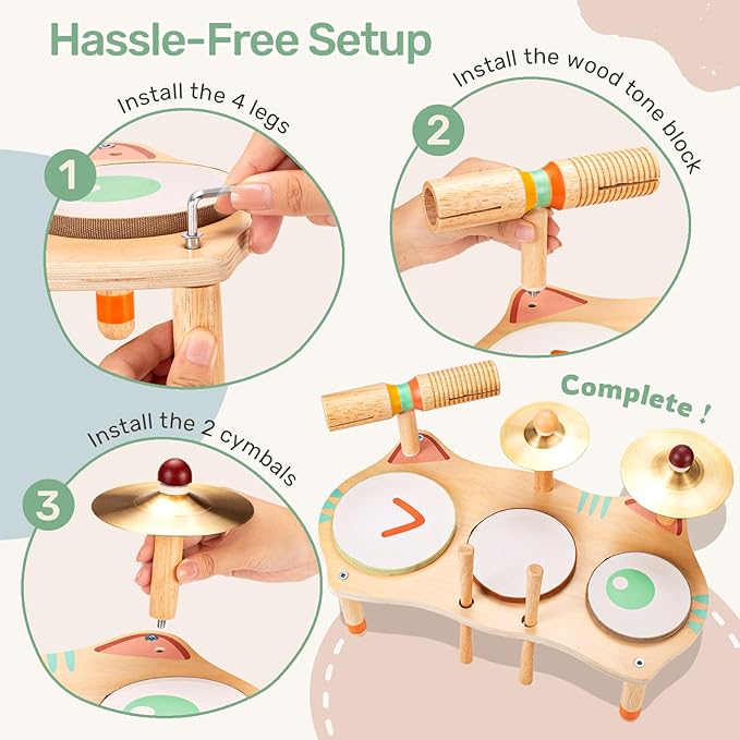 - Safe, Natural, and Sturdy: Made from natural wood with non-toxic paint, this baby drum set is designed with rounded edges for safety. Its stable structure ensures worry-free play for ages 3+
