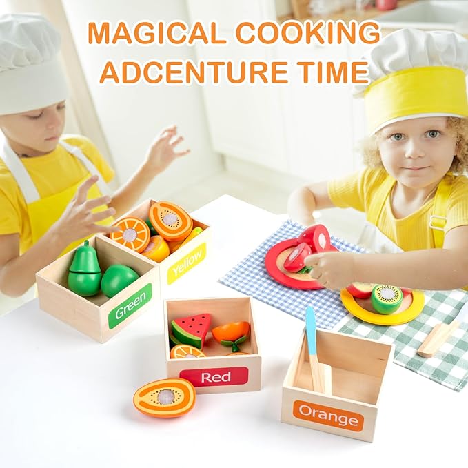 - Play Food Sets for Kids Kitchen: Kids can use the wooden toy knife to cut the different pretend foods, and then put the apart pieces in the correct color box. The sounds of "click" and "clack" bring kids much fun during cutting. They can be easily reconnected through the velcro for the next play. Through pretend play, children can learn the internal structure and realistic structure of different foods, which helps develop a better conception of fruits and vegetables that occur in daily life.