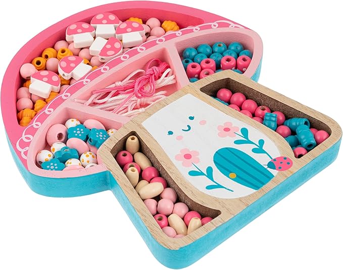 Stephen Joseph, Wooden Bead Kit for Kids, 125 Wooden Beads with 4 Necklace and 4 Bracelet Cords with Reusable Wooden Tray, Premium Wood Jewelry Making Kit for Kids, Mushroom