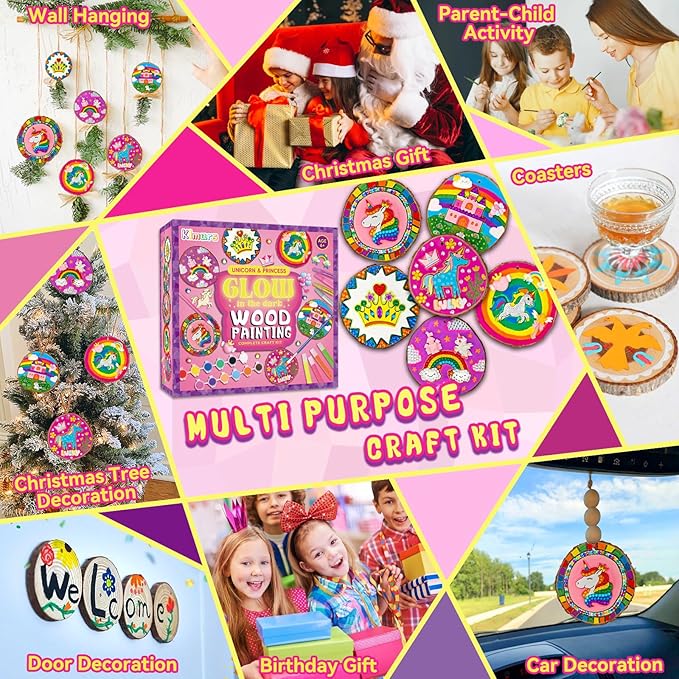 klmars Unicorn Themed Wooden Painting Kit-Glow in The Dark-Arts & Crafts Gifts for Kids Girls Ages 5-12-Wood Slice Craft Activities Kits -Unicorn Art Toys for Kids Christmas Gifts
