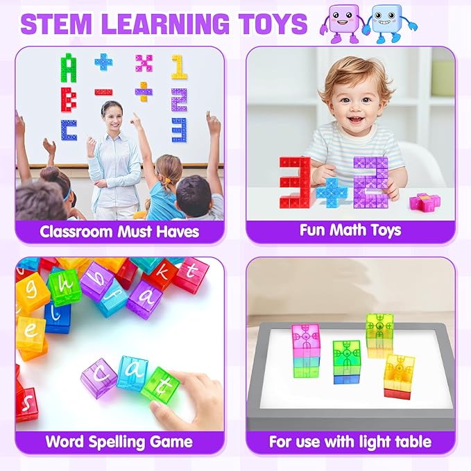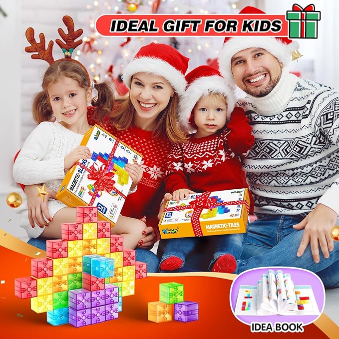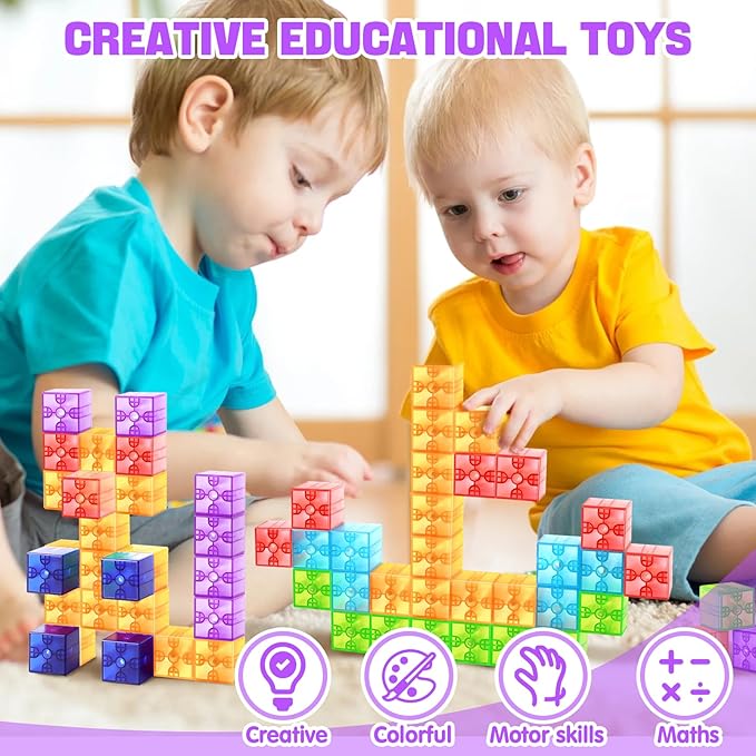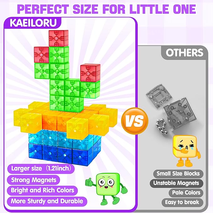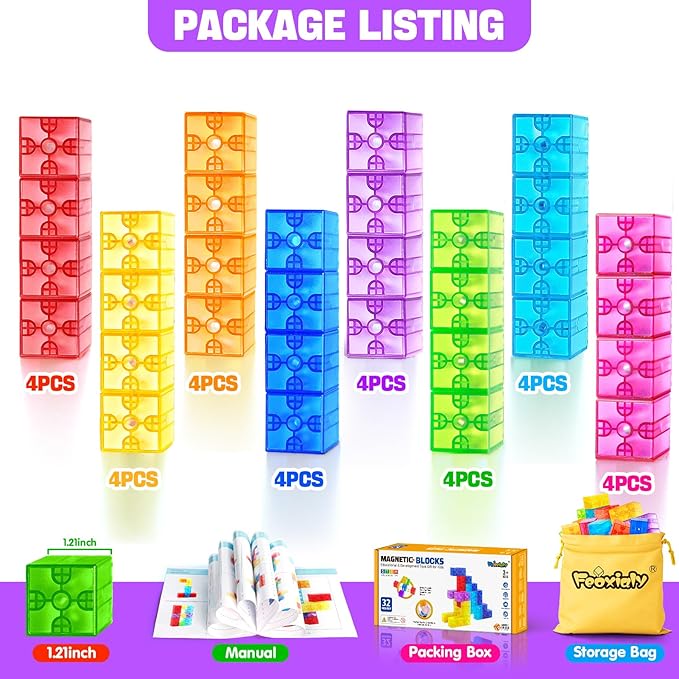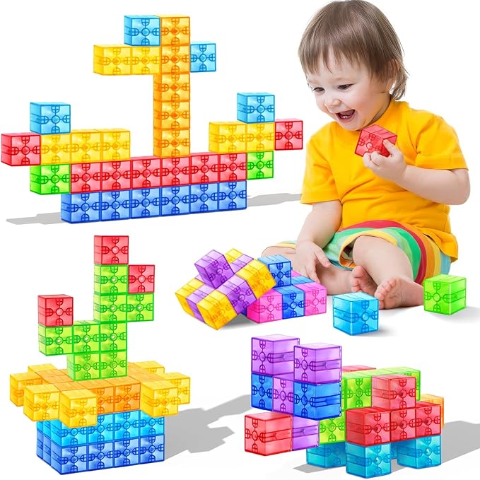 - Magnetic Building Blocks for Kids Toddlers – This 32-piece set of Translucent Magnetic Cubes for Kids 1-3 lets kids explore their creativity while building colorful structures. The easy-to-use magnetic blocks encourage imaginative play and help toddlers and young children bring their ideas to life with vibrant, stackable cubes.