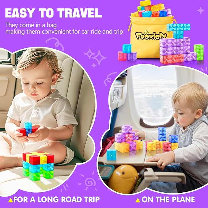 - Magnetic Cubes with Quick Storage Bag – The magnet toys for kids Ages 2-4 comes with a handy storage bag, making it perfect for travel. You can easily pop the bag into your backpack or luggage, ensuring your kids stay entertained during long car rides, flights, or even at restaurants and road trips.